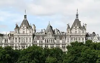 The building is the centre section of Whitehall Court, which was designed by Thomas Archer and A. Green. It was constructed as a block of luxury residential apartments in 1884.[1] The building's construction was the centrepiece of an elaborate pyramid scheme for fraud by the Liberal MP and property developer Jabez Balfour, through the Liberator Building Society which he controlled. In 1892 the Society collapsed, leaving thousands of investors penniless. Instead of advancing money to home buyers, the Society had advanced money to property companies to buy properties owned by Balfour, at a high price.[2][3] It achieved its listed building status due to its architecture, which is modelled on a French chateau.[1]