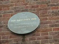 The college was founded by Colonel John Le Marchant at the Antelope Inn in 1799 as a facility for training junior officers in the British Army who aspired to staff duties.[1] Training was provided in trigonometry, geometry, French language and siege warfare.[2] The facilities proved too small and the institution moved to a building in West Street in Farnham in 1813 before being redesignated the Senior Division of the Royal Military College, Sandhurst in 1820 and then becoming the Staff College, Camberley in 1858.[3]