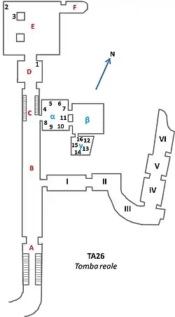 The Royal Tomb was cut in a small side valley off the main Royal Wadi, approximately 6 km (3.7 mi) from the valley's mouth and a further 4 km (2.5 mi) directly east of Amarna's central city.[1] It lies on the same axis as the Small Aten Temple.[40] The tomb was cut into the floor of the valley, facing approximately east[41] (actually southeast).[42] It descends back into the hillside for 53.245 m (174.69 ft).[43] Unlike previous royal Theban tombs, it has a straight axis. It is thought that this was intended to allow the sun's rays to shine all the way down into the burial chamber, something which does not work in practice. The layout of the main portion of the tomb is not substantially different to prior tombs. It was only cut as far as the first pillared hall which was adapted, through the removal of two pillars, into the burial chamber. The small, unfinished room in its north corner may be the start of the conventional bent axis.[44]