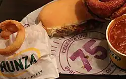 Founded in 1949 by Sally Everett, the chain began its expansion under Sally's son Donald Everett Sr. in 1966, and started franchising restaurants in 1979. As of November 2020, there are eighty-six Runza restaurants operating: eighty in Nebraska, two in Iowa, two in Colorado, and one in Kansas.[4][5] The restaurant chain is still owned by the Everett family, and Sally's grandson Donald Everett Jr. serves as President.[6] In addition to the namesake sandwich, the chain serves chili and cinnamon rolls[7] (another Midwest dish), as well as other fast food staples like hamburgers, french fries and onion rings.