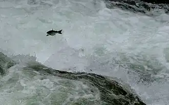 There is no direct road access to the river. It can be accessed either by hiking in from several Parking lots in the Russian River Campground (1/2 mile beyond Gwin's Lodge at Milepost 52) or by the Russian River ferry that crosses the Kenai and takes fishermen to the mouth of the Russian. There is a parking and ferry fee. The first parking lot in the Russian River Campground (past the toll booth, lot on the left) is the 2.3 mile walk to the Russian River Falls. This is a moderate relatively flat walk to great viewing platforms of the falls. Bears frequently fish below the falls, and further down stream.[2]