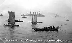 Sagami (center, rear) at anchor in Yokohama harbor during the Great White Fleet's visit, September 1908