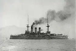 Hizen was assigned to the 1st Fleet on 1 December 1909[29] and was refitted in 1913.[32] After World War I broke out, she was dispatched to Esquimalt, British Columbia, in October 1914 to reinforce the weak British squadron there, then diverted to Honolulu, Hawaii, before the end of the month to watch the German gunboat SMS Geier after that ship arrived on 15 October. Hizen watched the port in company with the armoured cruiser Asama until Geier was interned on 8 November by the Americans. Afterwards she and Asama headed south in search of the German East Asia Squadron, but never located it;[28] the ship was recalled home in February 1915.[32] On 13 December 1915, Hizen was assigned to the 5th Division of the 3rd Fleet until relieved on 10 May 1917.[29] The ship served in the Indian Ocean at some point during the war where she probably escorted troop convoys.[32]