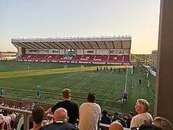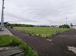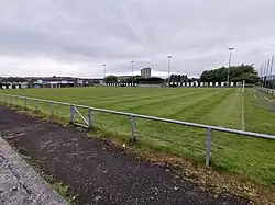 The club plays its home games at Hamish B. Allan Stadium in the Burnhill district of Rutherglen,[5] after the original Southcroft Park on Glasgow Road in the town's Shawfield district was demolished in 2007 to make way for the M74 motorway extension into central Glasgow.[6][7][8] The original ground had survived for 110 years and was the oldest Junior football ground in Scotland when it closed; the final game was a 1–0 victory over Dunipace in October 2006.[9] Its banked terracing areas also contained toxic Chromium VI, a byproduct from the nearby chemical factory;[10] this was also found to be the case at other stadiums in the local area: Lesser Hampden and Rosebery Park.[11][12]