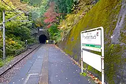 The station consists of a single side platform, serving traffic in both directions, with half of the platform located within a tunnel.