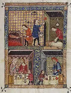 14. ^ "The Rylands Haggadah: The Preparation of the Paschal Lamb and the Marking of the Door (above); The Celebration of the Seder (below) [fols. 19v-20r]". www.metmuseum.org. Retrieved 2022-04-24.