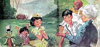 As for the use of certain terms, the researcher notes that Lobato uses them to get closer to the readers of the time, even using a dose of irony and that, if the author didn't specify Aunt Nastacia's ethnicity, her position of equality with Dona Benta would lead readers to understand that she was a white person.[26] And that, by dialoguing with the literary tradition of the time, Lobato causes a rupture, mainly by making Emília, whenever she offends her creator, end up being reprimanded, both by the characters and by the readers.[27] The researcher also notes that the reprimands Emília undergoes make it impossible for her to be the author's main "alter ego".[28] Also, the elements that today are considered racist are an intertextuality with children's literature that has already fallen into oblivion.[29] As for the work Caçadas de Pedrinho, the researcher notes that Lobato uses the term "monkey" in reference to various characters, always when explaining their physical prowess in comparison to the ape (at one point, Narizinho is described in this way after jumping on a slippery rock without falling), not as a derogatory comment.[30]