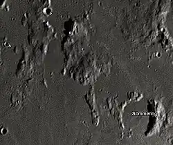Sömmering is the lava-flooded remains of a lunar impact crater on the eastern edge of the Mare Insularum. It was named after German doctor Samuel Thomas von Sömmerring.[1] To the southeast is the crater Mösting, and north of Sömmering lies a similar flooded crater designated Schröter. A rille designated Rima Schröter runs from the southeast of Schröter towards the east of Sömmering's outer rim.