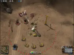 One of the special and innovative features of the game engine is the direct display of the minimal and maximal firing range of a unit by dotted lines surrounding the unit. These lines fully adhere to the terrain just above the texture layer and are displayed in red for minimal and yellow for maximal range. While obvious, this tool from the world of turn-based strategies was most likely the first implementation in real-time tactics. The feature greatly enhances the gameplay and is also a signature component of the following StormRegion's Codename: Panzers series.