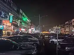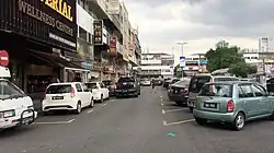 A street level view of one of the streets in the largest commercial zone in SS2, with shophouses on the left and parked cars on the right.