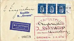 This voyage also marked the first time mail was carried by a ship-launched plane for delivery before the ship's arrival. A Heinkel HE 12 floatplane, flown by 27-year-old Luft Hansa pilot Baron Jobst von Studnitz, was launched at sea twenty miles east of Fire Island with 11,000 pieces of mail in six mailbags weighing 220 pounds (100 kg) which it delivered to New York many hours before the ship docked at the North German-Lloyd pier at the foot of 58th Street in Brooklyn.[2] On the return passage to Germany Bremen took the eastbound Blue Riband with a time of 4 days 14 hours and 30 minutes and an average speed of 27.91 knots (51.69 km/h), the first time a liner had broken two records on her first two passages. The mailplane was launched on the eastbound voyage in the English Channel near Cherbourg carrying 18,000 letters to Bremerhaven where it delivered the mail many hours ahead of the ship's arrival.[3][4] Bremen lost the westbound Blue Riband to her sister Europa in 1930, and the eastbound Blue Riband to Italian SS Rex in 1932.