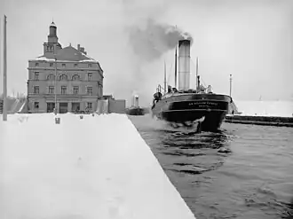On a May 1897 trip between Duluth and Fairport, Ohio, Sir William Siemens broke the record for the largest cargo of iron ore shipped from a Lake Superior port at 5,387 long tons (5,473 t), and with a draft of 16 ft 1 in (5 m).[39] In August that same year, she was warned for violating the rules of the St. Marys River.[40] She struck an obstruction at the north end of Bois Blanc Island near Amherstburg, Ontario, in September 1897.[41][42] On July 4, 1899, Sir William Siemens struck the wall of the Poe Lock due to a misunderstanding of signals, taking a large piece out of it; she reportedly sustained no damage in the incident.[43]