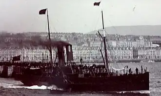 Tynwald and her sisters were considered fast vessels. Indeed, her older sister Snaefell, is recorded as having made the passage from Douglas to Liverpool in 4hrs 20 minutes, which would suggest a speed in excess of 15 knots.[6] On 15 June 1873, Tynwald collided with the steamship Sirius and the tug Guiding Star in the Sloyne.[7] On 6 October 1874, she collided with the sailing ship Annie Frost in the River Mersey.[8] On 6 December 1877, the brigantine Cerduc collided with a barque 20 nautical miles (37 km) north west of the Bar Lightship and was damaged. Tynwald answered her distress signal and towed Cerdic in to Liverpool.[9]