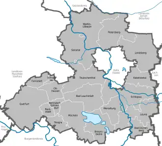 Saalekreis is a district in Saxony-Anhalt, Germany. The district seat is Merseburg. Its area is 1,434.2 km2 (553.7 sq mi).[2] It is bounded by (from the west and clockwise) the districts Kyffhäuserkreis (Thuringia), Mansfeld-Südharz, Salzlandkreis, Anhalt-Bitterfeld, Nordsachsen, Leipzig (both Saxony) and Burgenlandkreis. The district-free city of Halle is surrounded by the Saalekreis.