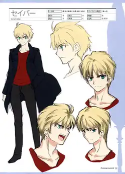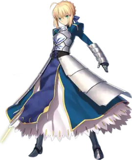Saber appears in the anime and manga versions of Fate/stay night, and the film Unlimited Blade Works.[28][29] Three of versions of Saber—regular, Saber Alter, and Saber Lily—appear in the fighting game Fate/unlimited codes.[30] The Lily form is based on Saber's alternative outfit from Unlimited Blade Works, which development staff noted was well received by fans.[31] A Lion form of Saber also appeared in Fate/tiger colosseum.[32] Saber, along with other characters from Tsukihime, Melty Blood, and the other characters of Fate/stay night, appears in the 2011 anime Carnival Phantasm.[33] Saber also appears in the series Fate/Labyrinth as Manaka's servant during the Subcategory Holy Grail. Together, they defeat many opponents and the bosses of each of the floor levels in Caubac Alcatraz's labyrinth.[34]