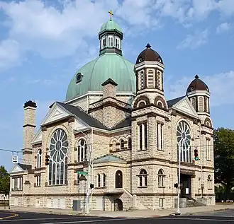 Designed by Charles Insco Williams, Sacred Heart is a limestone building with a limestone foundation, an asphalt roof, and various elements of sandstone and copper;[4] the limestone was quarried locally, while the sandstone was obtained from Berea, Ohio. Constructed in the Romanesque Revival style,[2]: 360  but with a prominent octagonal Baroque dome and glazed cupola, towers flank the main entrance, and there are rose windows under the pediments of the front and side.[4] When constructed, the building featured a basement under the 75-foot ceiling, and its general plan was 115 by 92 feet, or 23, 35, and 28m respectively.[2]: 360  Grand woodworking, artwork, and chandeliers once filled the interior, but most have been removed; some were destroyed by the raging waters of the Great Flood of 1913, while others were intentionally removed or painted over at later dates.[3]
