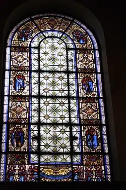 The 19th-century stained-glass windows have a large amount of white glass, to increase the amount of light in the church. The colors change with the light throughout the day.