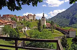 Saint Germain Castle (left), Gruyères Castle (center) and Saint-Théodule Church (right, foreground)