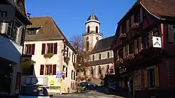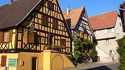 The old village consists of three parallel streets cut by side streets and alleys between half-timbered houses, forming a compact oblong area still contained within a wall. The village centre contains the church, town hall and a 19th-century school building.