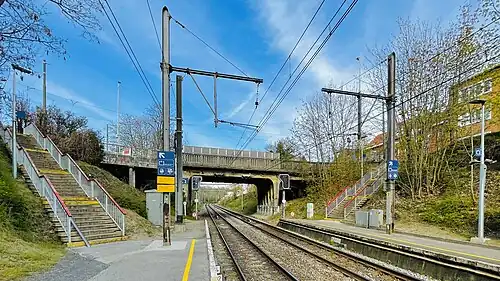 Saint-Job railway station (French: Gare de Saint-Job) or Sint-Job railway station (Dutch: Station Sint-Job)[a] is a railway station in the municipality of Uccle in Brussels, Belgium. The station, operated by the National Railway Company of Belgium (NMBS/SNCB), is located on line 26, between Boondael and Moensberg railway stations.[1] The station is named after the nearby Place de Saint-Job/Sint-Jobsplein.