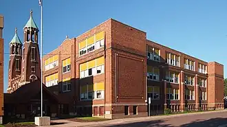 The former Saint Bernard's High School with the Church of Saint Bernard in the background