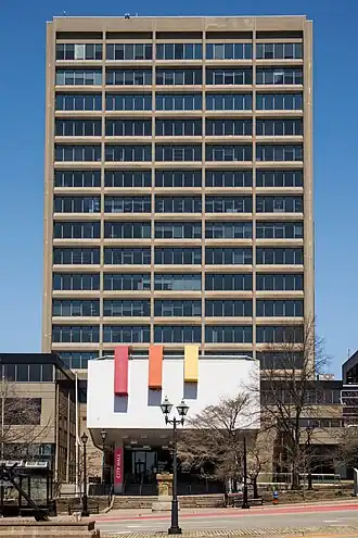 The current City Hall, built by private Toronto-based development company Corporation Eighteen Ltd.,[7][8] was built at a cost of $6 million (equivalent to $45.1 million in 2023) and featured 17 stories,[9][10] though it now only has 16.[11] Claude Roussel's design of three aluminum columns painted red, orange and yellow at the exterior entrance of the City Hall was chosen, much to the dismay of some members of the public as well as Saint John Mayor Bob Lockhart, who called the design a "disaster and a personal disappointment."[12][13][14][15]