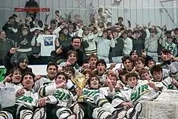 The ice hockey team was the state champion in 1984, 1985 and 1991, and won the Gordon Cup in 1986, 1990 and 1992.[36] In 2010, SJR hockey, who entered the NJTCC Cup as the lowest seed, upset top-seeded Passaic Valley High School and DePaul en route to the championship on February 28. In 2011, the Green Knight Hockey team defeated Hackensack in the first round 6–3, and then defeated Ramapo High School by a score of 2-1 before losing 2–0 to second-seeded Wayne Valley High School in the finals. In the winter of 2013, the SJR Ice Hockey team won their fourth league championship appearance in a row. In 2015, the team reached the state quarterfinals after upsetting the #2 ranked Don Bosco Preparatory High School in the Round of 32. The Green Knight Hockey Team reached the state quarterfinals once again in 2016, losing to Pope John XXIII Regional High School in overtime. The team will rejoin the Gordon Conference after spending nearly two decades in the Big North Conference. In 2025, the team won their first Bergen County championship after defeating Don Bosco Preparatory High School by a score of 2–0 in the tournament final.[37] That year they were ranked the #3 team in the state of New Jersey rankings by NJ.com making the highest ranking ever in school history.