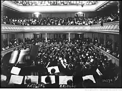 The hall opened its doors on 3 October 1907 for the concert of the Lehrergesangverein (Teachers' Choir of the city of Bremen with one hundred and forty performers). It immediately became a prestigious hall. Camille Saint-Saëns' concert in the Salle Gaveau [audience and orchestra from the stage];[4] then other famous musicians gave concerts there from the first months after the opening. The concerts Lamoureux, conducted by Camille Chevillard, Vincent d'Indy and André Messager, moved to Gaveau. On 5, 8 and 12 November 1907, Alfred Cortot, Jacques Thibaud and Pablo Casals performed the complete trios by Beethoven. In the following years, the Salle Gaveau hosted Eugène Ysaÿe (21 January 1908), Lazare-Lévy (27 January 1909), Marguerite Long[5] (11 December 1911), Georges Enesco (8 February 1912), Fritz Kreisler (21 and 28 April 1912), Wilhelm Backhaus (15 May 1912), Claude Debussy (5 May 1917).[6]