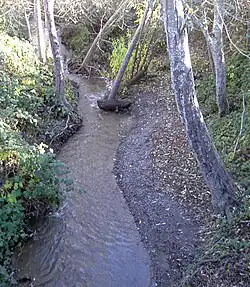 Salmon Creek originates about 2 miles (3 km) west of the town of Occidental near the junction of Joy Road and Bittner Road.[1] It parallels Bittner Road eastward, passing just south of Occidental, where it turns right and follows Bohemian Highway to the town of Freestone. From there, it curves south and then west, passing Watson School historic park as it parallels Bodega Highway to a confluence with Nolan Creek just east of the town of Bodega. It flows through Bodega, then follows Salmon Creek Road westward into a narrow canyon, where it is joined by Tannery Creek, Fay Creek, Coleman Valley Creek, and Finley Creek. Salmon Creek emerges from the canyon between Irish Hill and Coleman Hill and crosses State Route 1 at milepost 12.49, entering Sonoma Coast State Beach south of the ranger station. It parallels Bean Avenue to Salmon Creek Beach, which it bisects as it enters the Pacific Ocean.