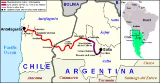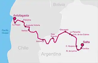 The Salta–Antofagasta railway, also named Huaytiquina,[2] is a non-electrified single track railway line that links Argentina and Chile passing through the Andes. It is a 1,000 mm (3 ft 3+38 in) metre gauge railway with a total length of 941 km (571 in Argentina[3] and 330 in Chile), connecting the city of Salta (Argentina) to the one of Antofagasta (Chile), on the Pacific Ocean, passing through the Puna de Atacama and Atacama Desert.