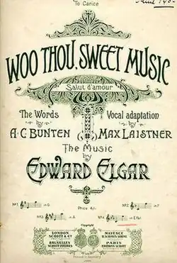 "Salut d'amour" is one of Elgar's best-known works and has inspired numerous arrangements for widely varying instrumental combinations. There are also versions with lyrics in different languages, for example the song "Woo thou, Sweet Music" with words by A. C. Bunten,[5] and "Violer" (Pansies) in Swedish.