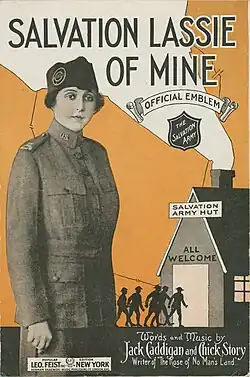 Salvation Lassie Of Mine is a World War I song written by Jack Caddigan and Chick Story.[1] The song was first published in 1919 by Leo Feist, Inc. in New York, NY. The sheet music cover features a photo of a Salvation Army nurse with soldiers entering a Salvation Army hut.[2] This song was in the top 20 charts in March and April 1919, reaching number 18 in April.[3]