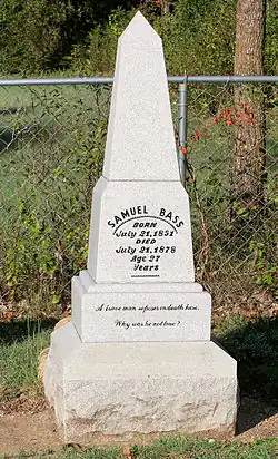 Samuel Bass (July 21, 1851 – July 21, 1878) was a 19th-century American train robber, outlaw, and outlaw gang leader. Notably, he was a member of a gang of six that robbed a Union Pacific train in Nebraska of $60,000 in newly minted gold from San Francisco, California. To date, this is the biggest train robbery to have been committed in the USA. He died as a result of wounds sustained in a gun battle with law enforcement officers.