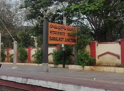 Samarlakota railway station (station code:SLO)[1] is an Indian Railways station in Samarlakota of Kakinada district in the Indian state of Andhra Pradesh. It lies on the Howrah–Chennai main line and a junction station for Samarlakota–Kakinada Port branch line, administered under Vijayawada railway division of South Coast Railway zone (formerly South Central Railway zone).[2]