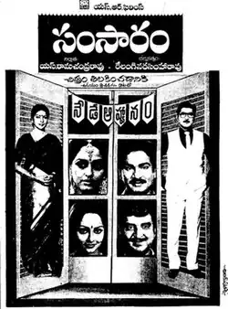 Samsaram (transl.Family) is a 1988 Telugu-language drama film, produced by Sakhamuuri Ramachandra Rao under the SR Films banner and directed by Relangi Narasimha Rao.[2] It stars Sobhan Babu, Jaya Prada, Sharada, Rajendra Prasad, Rajani and music composed by Raj–Koti.[3] The film is a remake of the Malayalam film Oru Painkilikatha (1984) which was earlier remade in Tamil as Thaaiku Oru Thaalaattu (1986). The film was recorded as a Super Hit at the box office.[4]