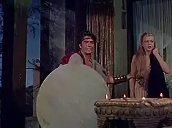 The film's special effects were supervised by Gordon Jennings.[70] The most spectacular special effect in the film is the toppling of the temple of Dagon, the god of the Philistines.[70] It is the penultimate scene in the film, cost $150,000, and took a year to shoot.[70] The bottom portion of the temple was constructed full-scale.[70] A separate 37-foot high model with a 17-foot high Dagon statue was built for the photographic effects.[70] The model was destroyed three times to shoot it through different camera angles.[70] Footage of the full-scale set was merged with footage of the scale model using a "motion repeater system" fabricated by Paramount, which enabled the exact repetition of camera moves.[70]