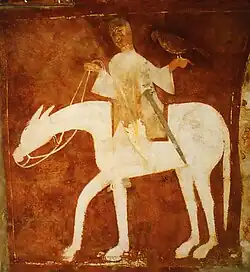 The hermitage housed many fine Romanesque frescoes from about 1125; most of these have been removed, but some have remained. Two sections, transferred to canvas, are now in the Indianapolis Museum of Art, showing the Entry of Christ into Jerusalem and the Wedding at Cana.[7] Other sections, including The Healing of the Blind Man and the Raising of Lazarus and The Temptation of Christ are in the Metropolitan Museum of Art in New York,[8] and in the Prado. The paintings are considered the work of three anonymous local artists. All decorative motifs on arches and vaults, as well as the large biblical scenes and the paintings on the apse, are attributed to the Master of Maderuelos, or First Master of Casillas. The hunting scenes of the lower areas, which are the most original, are attributed to the Master of San Baudelio. A third master of more modest proficiency is considered the author of the paintings inside the choir. [The paintings were done by the Catalan Master of Tahull (Taüll in Catalan), whose best known works are in Sant Climent de Taüll and the Museu Nacional d'Art de Catalunya in Barcelona,[9] with two other painters.]? The scenes of the Life of Christ are unusual in Spanish painting at this period; these are in American museums, while smaller elements including scenes of hunting and falconry and decorative copies of textiles are in Madrid as well as New York.[10] The frescoes include that of a camel and of a war elephant, which were inspired by Muslim motifs.[1]