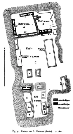 Plan of San Clemente as published by German explorer Karl Sapper in 1897. Note the structure numbering differs from that in later use.