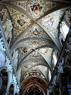 The second chapel on the right is dedicated to Saint Oliva, and has a portal with sculptures by Giacomo Gagini depicting the Madonna delle Grazie flanked by St Oliva and St Francis. The interior decoration dates mainly to the 17th and 18th century. The ceiling frescoes depicting saints, the four evangelists, and the four doctors of the church, as well as scenes from the life of St Francis of Paola, were painted by Giuseppe Salerno.[2]