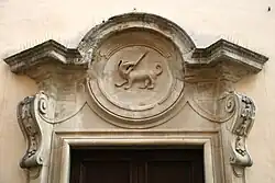 The portal of the church, in sandstone, has a dog with a candle in its mouth in bas-relief in the tympanum, a play on the phrase Domini canes, or ("Hounds of the Lord"). On the side of the main entrance there is access to the cloistered convent.[1]