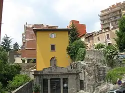 When the veneration of the image first began, it must have been located in an open-air roadside aedicula along the then public road leading to Castel Gandolfo and Albano Laziale, corresponding to today's Via Antonio Fratti.[9] The image was connected to the built-up area by a staircase of thirty-four steps carved into the peperino stone, which allowed the visitor to avoid the steep bend in the road and which is still visible today at the back of the sanctuary.[9] The veneration of the image is also linked to a miraculous event reported by popular tradition: it is said that a man, while riding his horse on the Via Maremmana Inferiore in the direction of Castel Gandolfo and Albano Laziale, lost control of the animal in the hairpin bends of the road and was in danger of falling into the precipice had not Our Lady intervened to save him.[10] In the following centuries, other miracles were attributed to the Virgin of Acquasanta: in August 1883, the high prelate Pietro Rota,[11] archbishop of Carthage and canon regular of the St. Peter's Basilica in Rome, made an ex voto to Mary to thank her for saving him from a ruinous fall from a horse in the precipitous paths on Lake Albano;[12] and so many other episodes,[12] even quite serious ones.