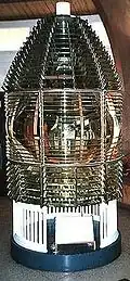 The first lighthouse on Sand Island, constructed by Winslow Lewis in 1837, was a 55-foot (17 m) structure completed in 1839. The lighting was provided by 14 lamps in 16-inch reflectors and a first-order lens, known as the Lewis lamp, which was a poorly designed version, or Argand-style lamp.[4] Lewis enjoyed a monopoly through his relationship with Stephen Pleasonton that lasted until 1853.[5]