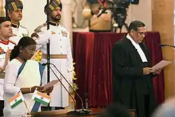 President Droupadi Murmu administering the oath of office to Justice Sanjiv Khanna as the Chief Justice of India.