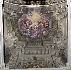This is located on the barrel vault and is a highly illusionistic scene: above the real entablature, Barbelli painted a balcony in perfect perspective with angels and cherubs sitting on the balustrade. On the corner pedestals, Barbelli painted the four Evangelists.[24]