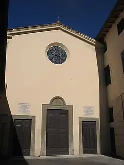 Starting in 1589, with the approval of the municipal authorities, Ganucci used 600 scudi to buy the houses and land on this street.[2] In 1590, with the blessing of the bishop, Ganucci led a procession and prayer ceremony to lay the first stones.[3] The municipal authorities gave permission to the builders to gather stone and materials from various abandoned churches in the region. Worked progressed in building the wall surrounding the monastery and other buildings when Ganucci died in 1595.[4] It appears that after his death, the bishop of Pisa laid claim on the inheritance of Ganucci, claiming that his daughter could no longer be abbess, and that the wall surrounding the monastery was not yet complete. The legal dispute was protracted. In 1607, the onslaught of the plague killed all four executors of the Ganucci estate. Their replacements, with the help of Simone, the widow of Ganucci, argued with the Pisan Bishop, among other points, that all of Montopoli was a walled town, hence apt for a monastery. An appeal to the Grand-Duke Cosimo II de Medici, allowed for the completion of the monastery.[5] Suddenly in 1613, the Papal court in Rome made an argument that the inheritance, which had failed to form a monastery, should be transferred to them. This was strongly opposed by authorities in Montopoli, and ultimately resolved by 1618, when a visit had demonstrated nearly all the facilities and a church necessary for the function of a cloistered convent, including interior church, sacristy, dormitory, refectory, rooms for work, infirmaries, kitchen, and a parlatorio (parlor for conversing with the outer world). The visit made note of all the requirements to cloister the nuns, including windows through which to pass supplies for the kitchen, and screens so that the nuns could attend mass unseen. Ultimately the monastery received a papal bull of approval by Pope Paul V.[6]