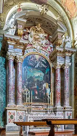 The altar consists of a large Baroque scenographic apparatus, completely assigned to the hand of Santo Calegari the Elder. The composition is dynamic and elegant, both in terms of the architectural solutions adopted and the profusion of polychrome marble. It serves as the antependium the funerary urn of St. Antigius, engraved with the dedication "S. Antigius / Ep.", closed by a grill.[85] The altarpiece, on the other hand, is the large Nativity of Jesus by Lattanzio Gambara, generally considered among his masterpieces.[86][87]