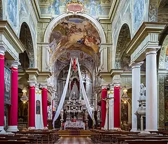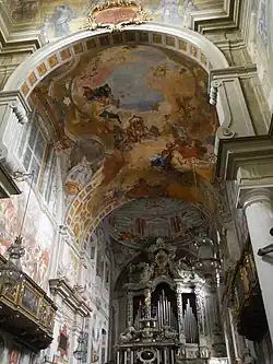 All the ceilings of the hall, both the central and side vaults, are completely frescoed with the illusionistic architecture of Tommaso Sandrino,[78] complemented by scenes by other authors. The extensive fresco on the nave consists of a continuous balustrade, supported by corbels, on which rest mighty Solomonic columns supporting a false ceiling, ideally higher and deeper than the real one. The basic balustrade is not linear, but follows a continuous ascent and descent of faux staircases that bypass the open lunette windows at the base of the vault. Finally, the whole is largely embellished with various decorations and architectural motifs. The work of Antonio Gandino and his son Bernardino is the large central panel, depicting the Glory of the martyred saints Faustinus and Jovita. The fresco depicts the two saints as they ascend to heaven in the presence of the Trinity amid a riot of musician angels. The two ascending saints wear transparent, fluttering white robes and wear stoles in the manner of the priestly Faustinus and the diaconal Jovita, so as to make specific the identity of each according to the data of tradition.[78]