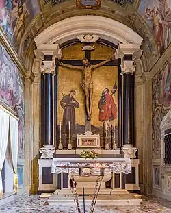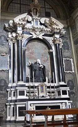 In the large central panel is placed perhaps the most singular altarpiece in the city's artistic history:[94][95] a statue of St. Benedict kneeling and praying, with his pastoral staff, mitre at his feet and a raven offering the saint a bread held in its beak. On the backdrop of the niche is a fresco depicting a flight of angels and the abbey of Montecassino, the work of Sante Cattaneo, who would, however, have merely repainted an identical theme already present.[96]