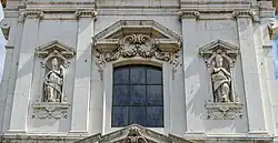 The four lesenes are not equidistant, but the central intercolumn is wider to accommodate the entrance portal to the church. Two free-standing Tuscan columns, resting on a high pedestal, frame the opening, while the upper entablature is covered with a rich decoration of plant motifs. This is followed by a low arched pediment immediately broken to allow the elevation of a rich crest, decorated with putti, volutes and floral motifs. In the central panel is the Martyrdom of Saints Faustino and Giovita by Santo Calegari the Elder, a marble high relief with iron inserts, usually remembered as one of the great masterpieces of Brescian Baroque sculpture.[56] Of great effect within the scene is the figure of the executioner completely in relief, whose drawn sword, made of iron, even protrudes outside the frame. In the space between the two lesenes on the side of the portal, on the other hand, statues of the two titular saints, again the work of Santo Calegari,[56] are placed within niches. Inside the upper pediment, on the other hand, is placed a rich Baroque cartouche, one among the pieces made personally by Giuseppe Cantone.[57]