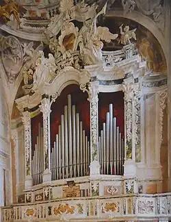 The case, painstakingly painted to simulate marble, is monumental in character. Despite its apparent secondary function of framing the organ pipes, the wooden apparatus plays an important role in completing the many elements that contribute to the beauty and harmony of the chancel. The fabrication of the large altarpiece can be ascribed to Giovanni Battista Carboni, including the four crowning statues, all very close to the accuracy and plasticity of Antonio Calegari's works.[112][113]